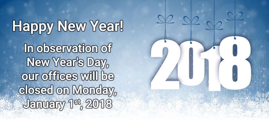 In observation of New Year’s Day, our offices will be closed Monday, January 1st, 2018.