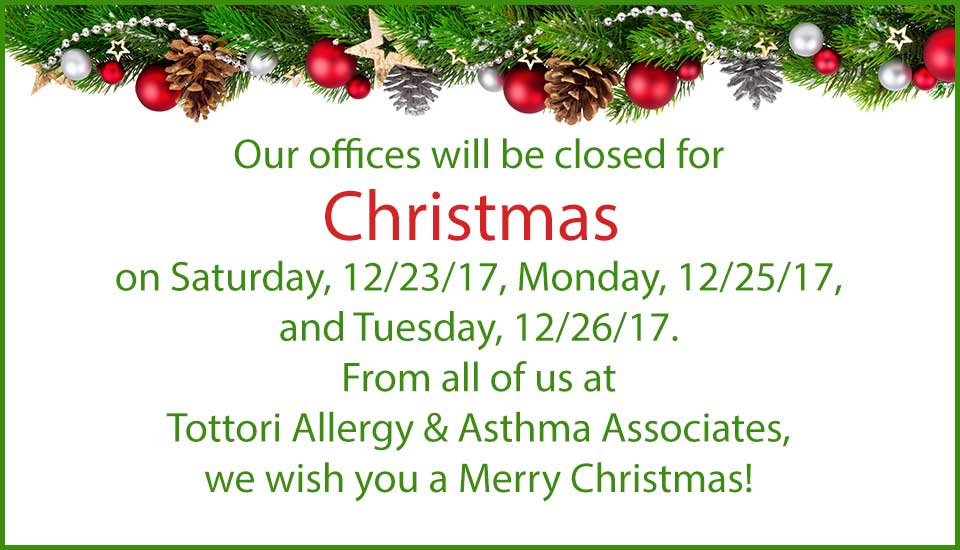 Our offices will be closed for Christmas on Saturday, 12/23/17, Monday, 12/25/17, and Tuesday, 12/26/17. From all of us at Tottori Allergy & Asthma Associates, we wish you a Merry Christmas!